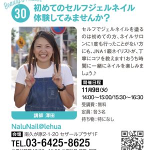 セルフでジェルネイルを塗るのは初めての方、ネイルサロンに1度も行ったことがない方にも、JNA1級ネイリストが、 丁寧にコツを教えます! おうち時間に一緒にネイルを楽しみましょう♪ 開催日程 11月9日(火) 14:00~ […]