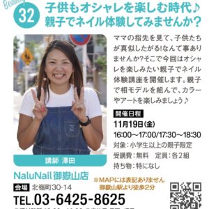 ママの指先を見て、子供たちが真似したがる!なんて事ありませんか? そこで今回はオシャレを楽しみたい親子でネイル体験講座を開催します。 親子で相モデルを組んで、カラーやアートを楽しみましょう♪ 開催日程 11月19日 (金 […]
