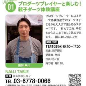 プロダーツプレーヤによるダーツ体験講座です!ダーツは子どもから大人まで楽しく参加できます。一緒に楽しみましょう! 対象:親子限定 受講費:無料 定員:各2組 持ち物:特になし NALU TABLE 会場:南 […]