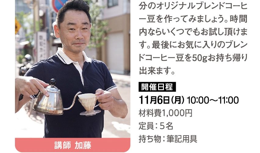 時間内ならいくつでもお試し頂けます。最後にお気に入りのブレンドコーヒー豆を50gお持ち帰り出来ます。