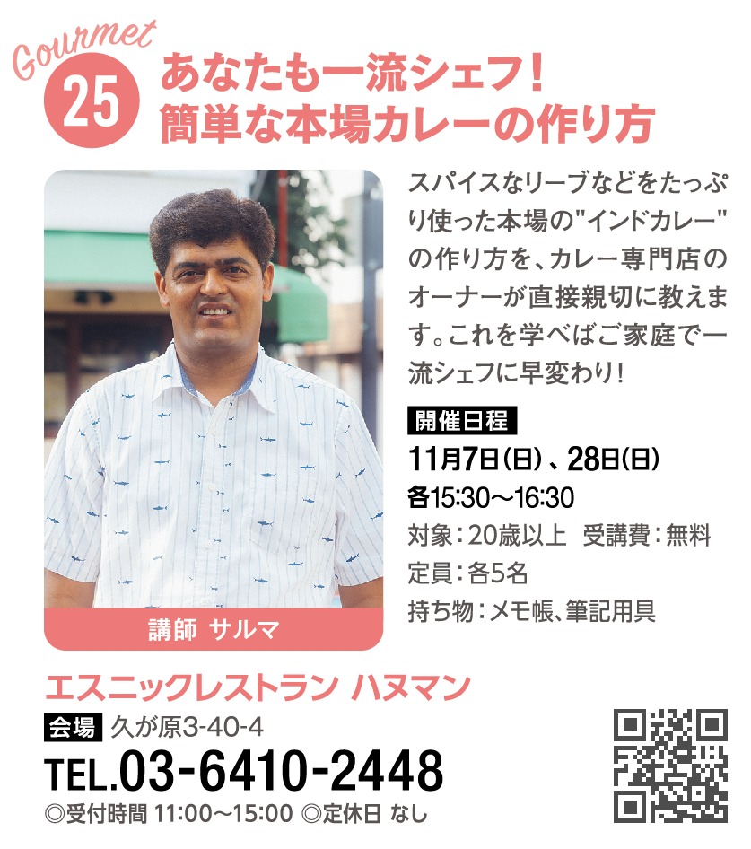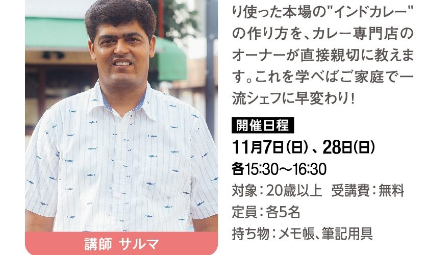 スパイスなリーブなどをたっぷり使った本場の”インドカレー”の作り方を、 カレー専門店のオーナーが直接親切に教えます。これを学べばご家庭で一流シェフに早変わり!