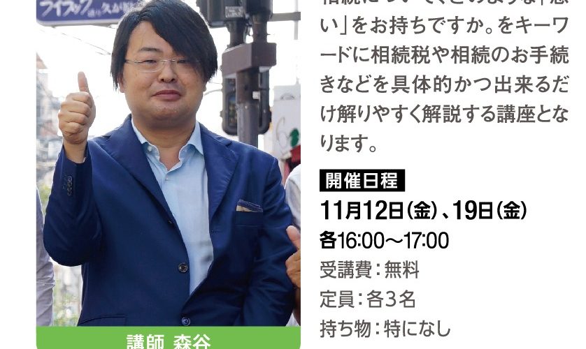 相続について、どのような「想い」 をお持ちですか。 をキーワードに相続税や相続のお手続きなどを具体的かつ出来るだけ解りやすく解説する講座となります。