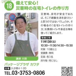 災害時、自宅が安全であれば、そこで避難生活を送りたいと思うのではないでしょうか。 その場合の「在宅トイレの作り方」を携帯トイレや身近な物を使ってご紹介します。 |開催日程 11月13日 (土) 10:30 11:30/1 […]